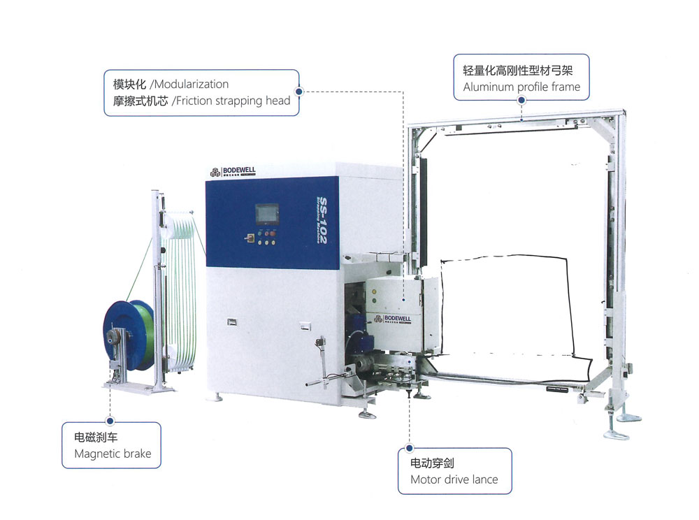 ● 可移動穿劍式側面捆扎機是側面穿劍式捆扎機的衍生機型,適用于貨物在固定工位,設備移動來實現(xiàn)多條打帶的場景。