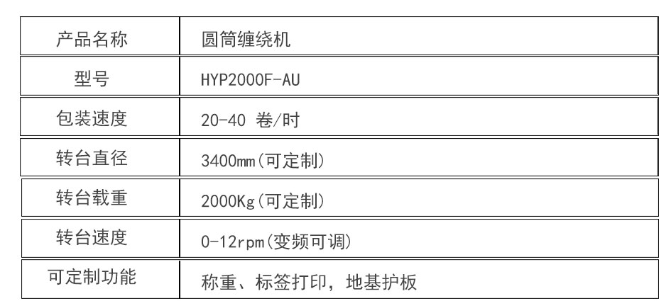 大宏佳森圓筒纏繞機(jī)HYP2000F-AU,包裝機(jī)采用PLC自動(dòng)控制,性能可靠,可根據(jù)需要改變纏繞方式和次數(shù);轉(zhuǎn)臺(tái)自動(dòng)復(fù)位,保證貨物進(jìn)出定位準(zhǔn)確;用戶可選擇拉伸或預(yù)拉伸薄膜裝置;根據(jù)客戶需求,選配光電控制頭,自動(dòng)測(cè)高;根據(jù)需要設(shè)計(jì)制造配套生產(chǎn)線。